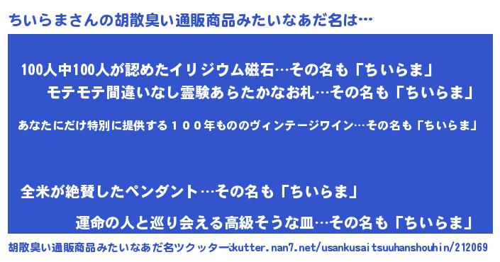 | 意味不明あだ名 | 『住所不定無職ちいらま(2歳)』 |