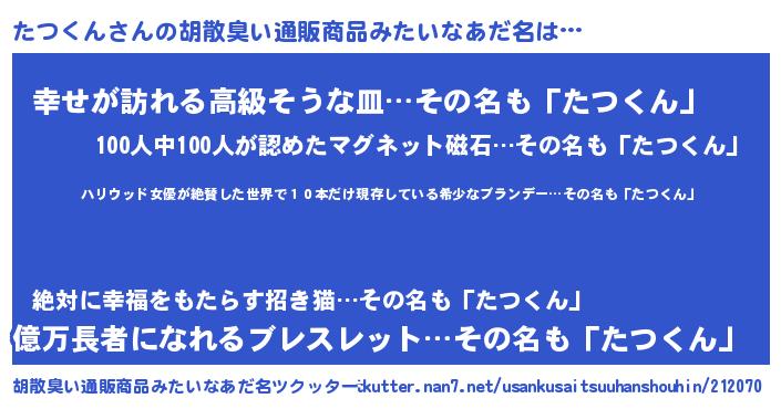 | ヘコむあだ名 | 『つくし』『たつもー』『たつお』 |