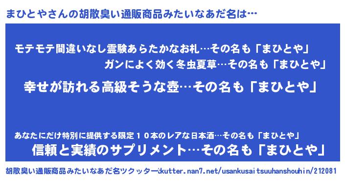| 女子向けラノベタイトル風あだ名 | 『まひとやの雑貨屋さん』 |
