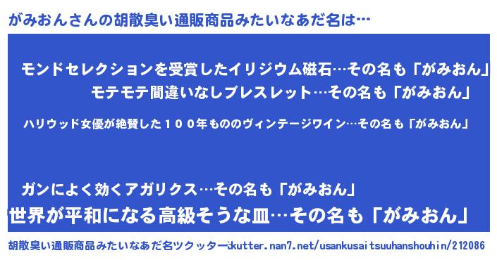 | 男性向けラノベタイトル風あだ名 | 『魔弾の王とがみおん』『がみおんの憂鬱』 |