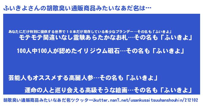 | 男性向けラノベタイトル風あだ名 | 『フイキヨスレイヤー』 |