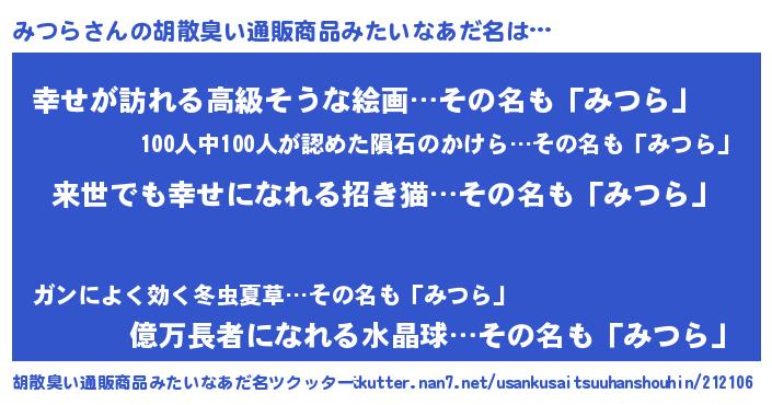 | 男性向けラノベタイトル風あだ名 | 『みつらという概念が存在しない退屈な世界 』 |