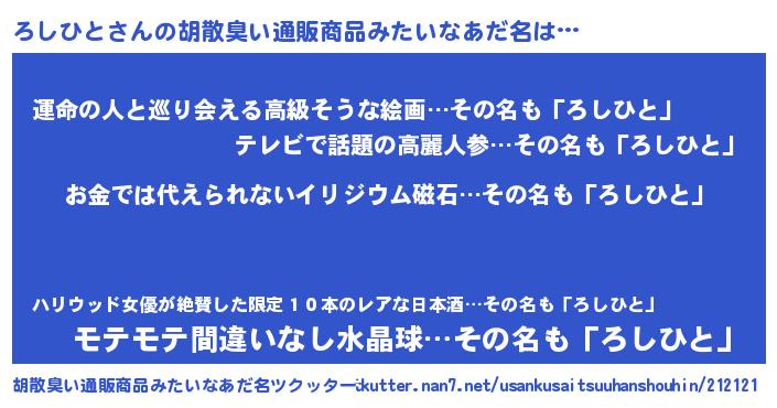 | ヘコむあだ名 | 『豆乳』『ろしもー』『ろしっ子』 |