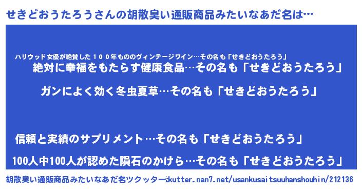 | 意味不明あだ名 | 『自称せきどおうたろう』 |