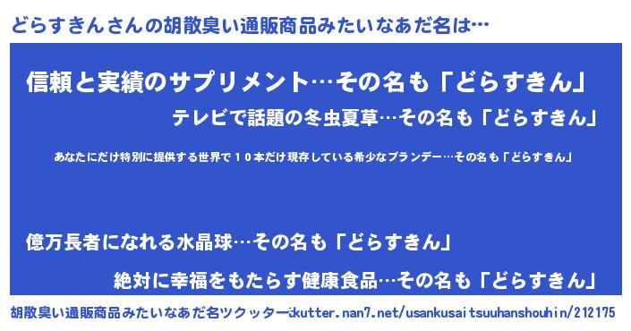 | 意味不明あだ名 | 『住所不定無職どらすきん(85歳)』 |