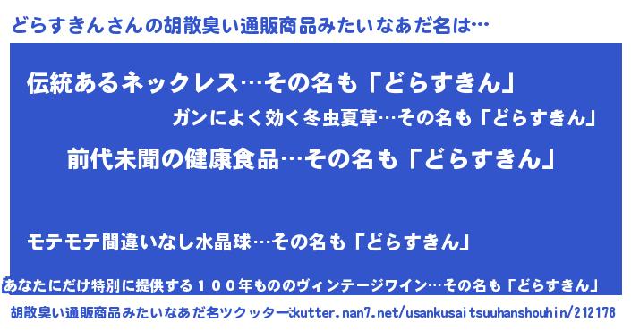 | 意味不明あだ名 | 『永久保存どらすきん』『自称どらすきん』 |