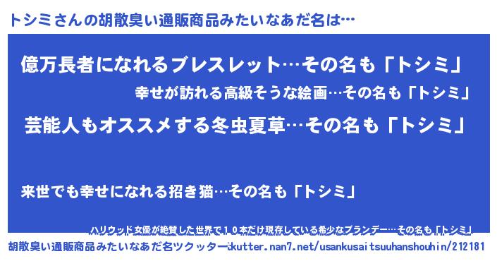 | 欧米人風あだ名 | 『アンジェラ・トシミ』『マイケルトシミ』 |