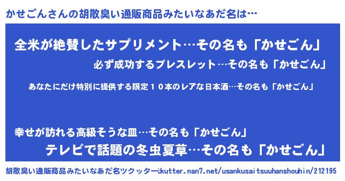 | 男性向けラノベタイトル風あだ名 | 『かせごん~年齢イコール彼女いない歴の魔法使い~』 |