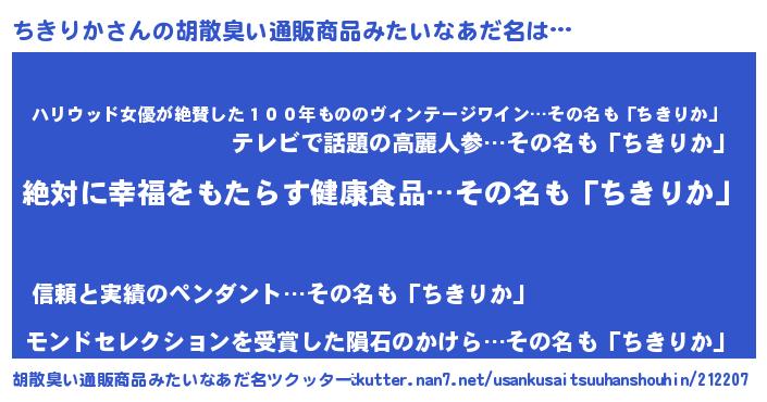 | 意味不明あだ名 | 『永久保存ちきりか』『自称ちきりか』 |