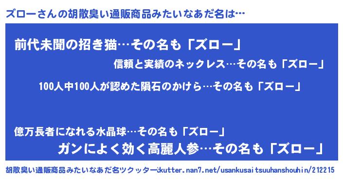 | ヘコむあだ名 | 『ズロー(震え声)』『ズロお』『牛乳』 |