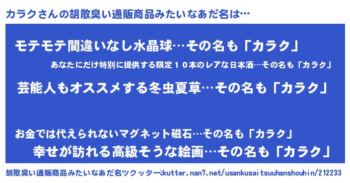 | 意味不明あだ名 | 『自称カラク』『ペロリンカラク』 |