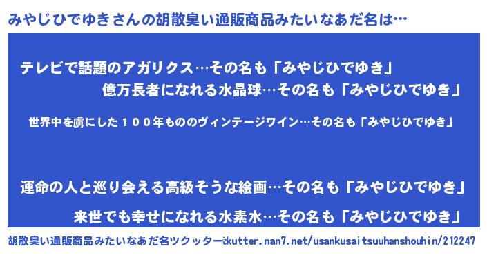 | 意味不明あだ名 | 『住所不定無職みやじひでゆき(3歳)』 |