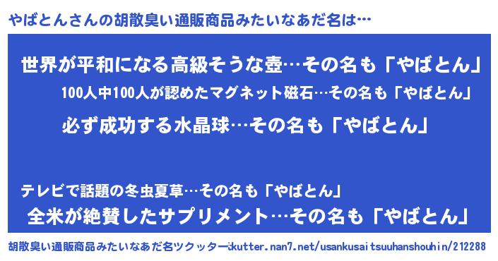 | 男性向けラノベタイトル風あだ名 | 『やばとんの憂鬱』『ヤバトンスレイヤー』 |