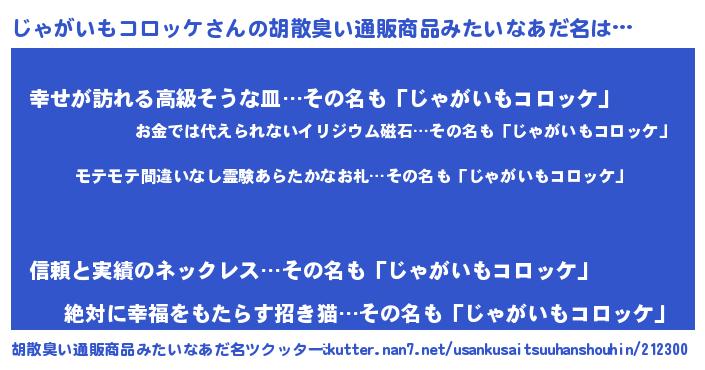 | 男性向けラノベタイトル風あだ名 | 『じゃがいもコロッケの憂鬱』 |