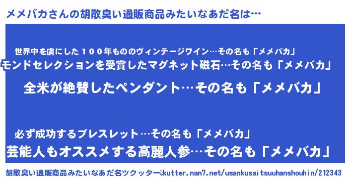 | 男性向けラノベタイトル風あだ名 | 『メメバカに滅ぼされるだけの簡単なお仕事です』 |