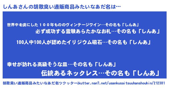 | 男性向けラノベタイトル風あだ名 | 『おまえをオタクにしてやるから、俺をしんあにしてくれ! 』 |
