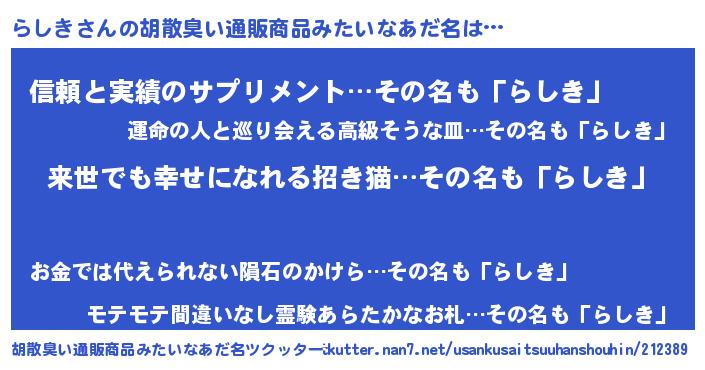 | ヘコむあだ名 | 『らしき(笑)』『らしぷりん』『豆乳』 |