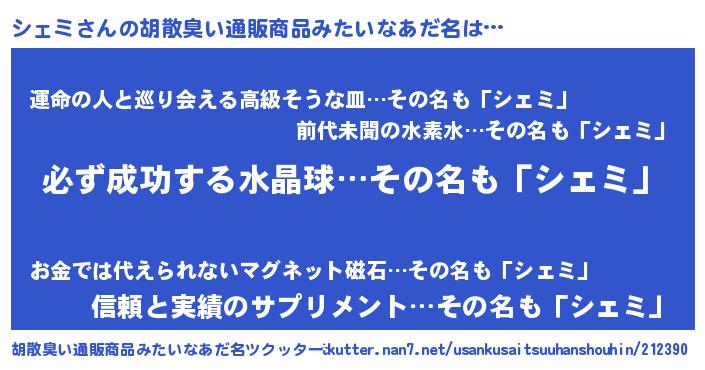 | 男性向けラノベタイトル風あだ名 | 『シェミスレイヤー』『シェミの憂鬱』 |