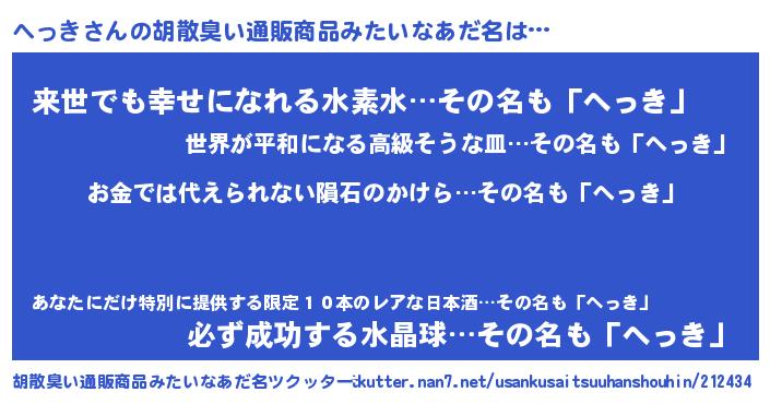 | 男性向けラノベタイトル風あだ名 | 『へっきに滅ぼされるだけの簡単なお仕事です』 |