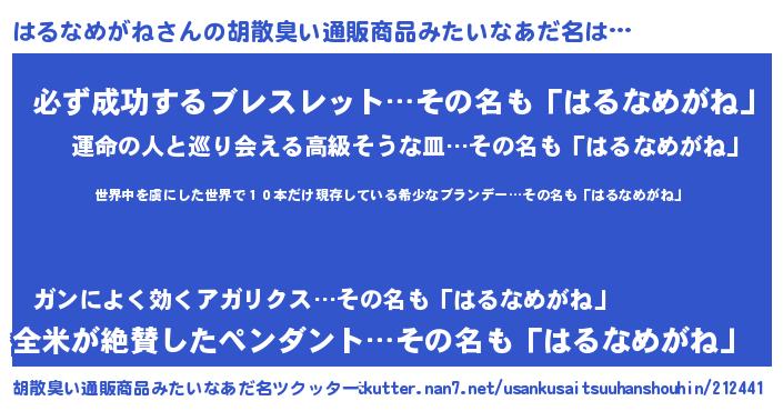 | 意味不明あだ名 | 『住所不定無職はるなめがね(74歳)』 |