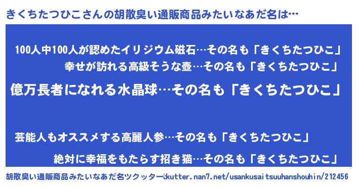 | 男性向けラノベタイトル風あだ名 | 『キクチタツヒコアートオンライン』 |