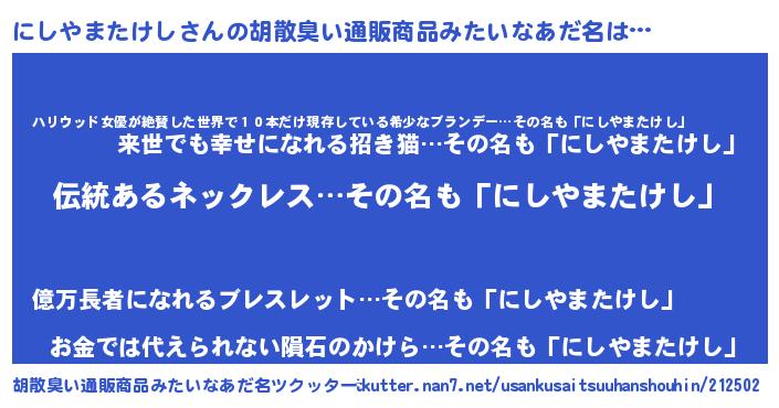 | 男性向けラノベタイトル風あだ名 | 『転生したらにしやまたけしだった件』 |