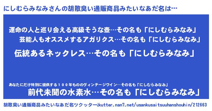| ポケモン風あだ名 | 『ヒニシムラミナミ』『ニシムダネ』 |