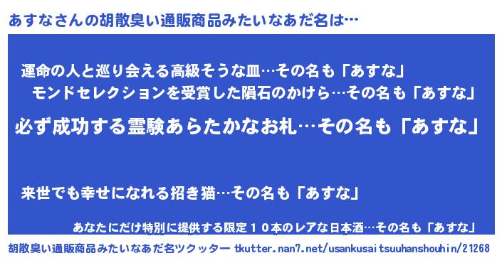 | ヘコむあだ名 | 『あすもー』『酢こんぶ』『あす太郎』 |