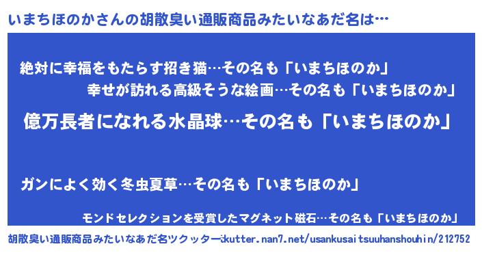 | 恥ずかしいあだ名 | 『プリティーいまちほのか』『いまちん』 |