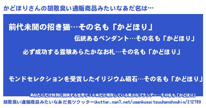 | 男性向けラノベタイトル風あだ名 | 『カドホリスレイヤー』 |