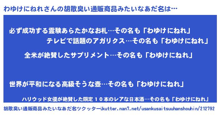 | 男性向けラノベタイトル風あだ名 | 『わゆけにねれの嫁は女の子じゃないと思った?』 |