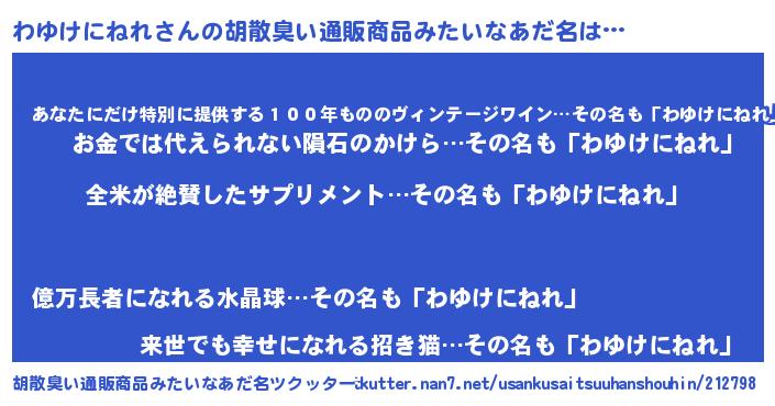 | 男性向けラノベタイトル風あだ名 | 『わゆけにねれの嫁は女の子じゃないと思った?』 |