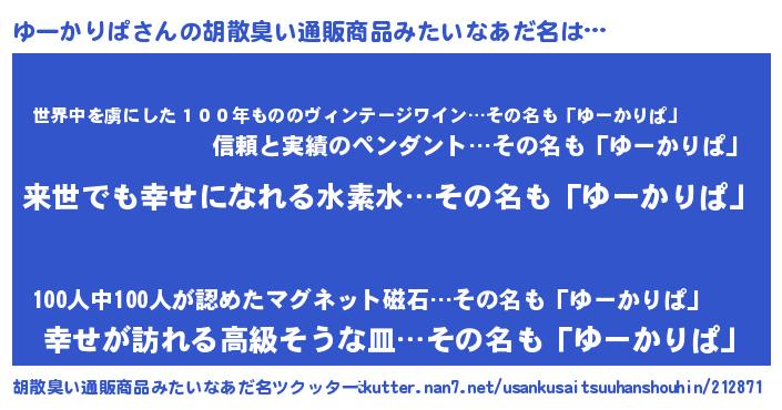 | ヘコむあだ名 | 『ゆーかりぱ(震え声)』『豆乳』 |