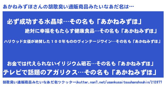 | 意味不明あだ名 | 『住所不定無職あかねみずほ(12歳)』 |