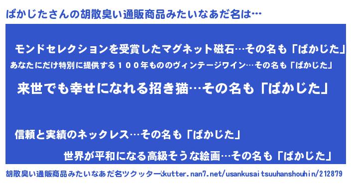 | 男性向けラノベタイトル風あだ名 | 『ばかじたという概念が存在しない退屈な世界 』 |