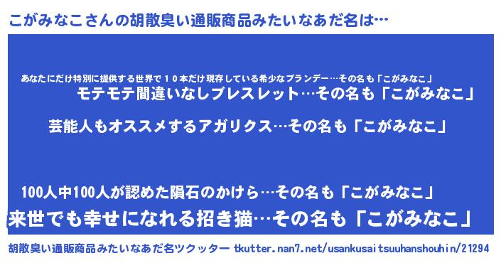 | ヘコむあだ名 | 『こがみなこ(爆)』『こがもー』 |