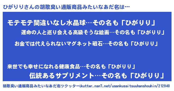 | 男性向けラノベタイトル風あだ名 | 『おまえをオタクにしてやるから、俺をひがりりにしてくれ! 』 |