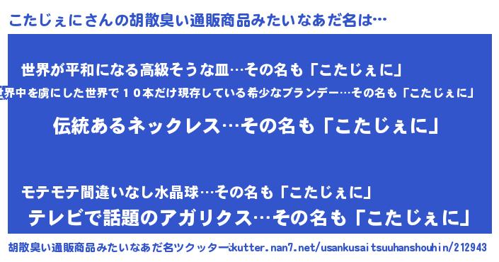 | 男性向けラノベタイトル風あだ名 | 『ダンジョンにこたじぇにを求めるのは間違っているだろうか』 |