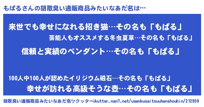 | 意味不明あだ名 | 『とにかく怪しいもぱる』『自称もぱる』 |