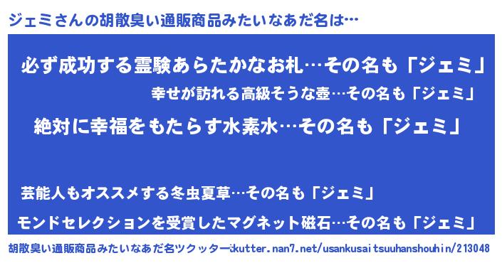 | ヘコむあだ名 | 『ジェミ(遠い目)』『ジェにゅー』 |