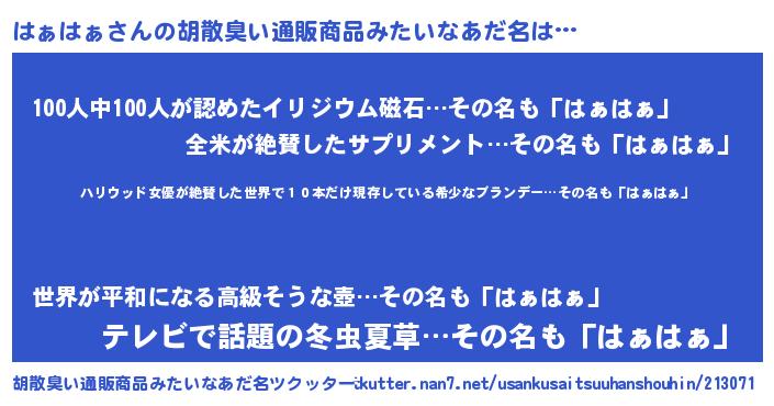 | 意味不明あだ名 | 『住所不定無職はぁはぁ(93歳)』 |