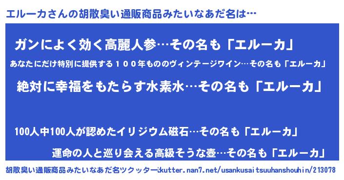 | 男性向けラノベタイトル風あだ名 | 『エルーカという概念が存在しない退屈な世界 』 |