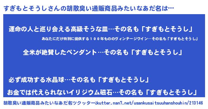 | 男性向けラノベタイトル風あだ名 | 『すぎもとそうしの嫁は女の子じゃないと思った?』 |