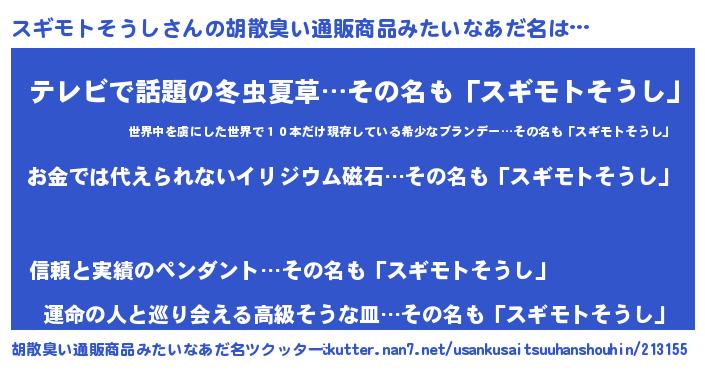 | 男性向けラノベタイトル風あだ名 | 『転生したらスギモトそうしだった件』 |