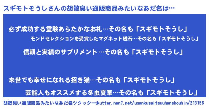 | 男性向けラノベタイトル風あだ名 | 『ダンジョンにスギモトそうしを求めるのは間違っているだろうか』 |