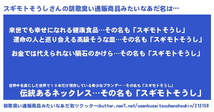 | ヘコむあだ名 | 『スギモトそうし(震え声)』『スギっ子』 |