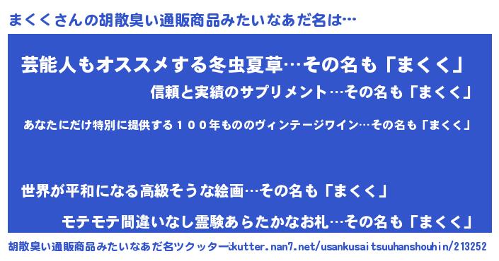 | 意味不明あだ名 | 『住所不定無職まくく(8歳)』『自称まくく』 |