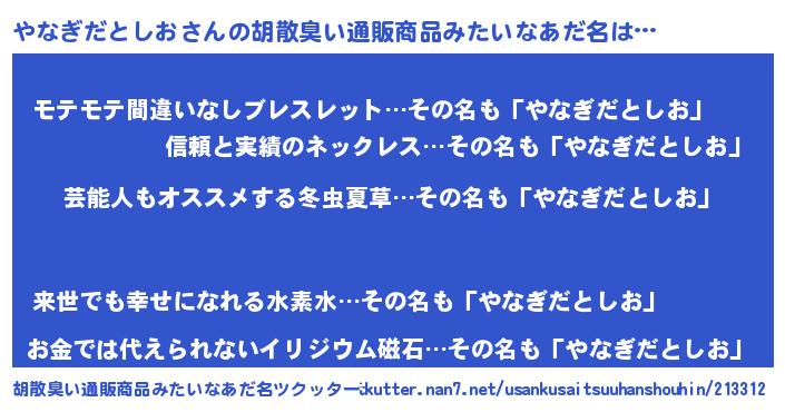 | 伝説のあだ名 | 『封印されしスナイパーやなぎだとしお』 |