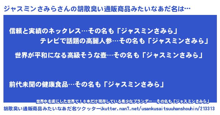 | 男性向けラノベタイトル風あだ名 | 『ジャスミンさみらに滅ぼされるだけの簡単なお仕事です』 |