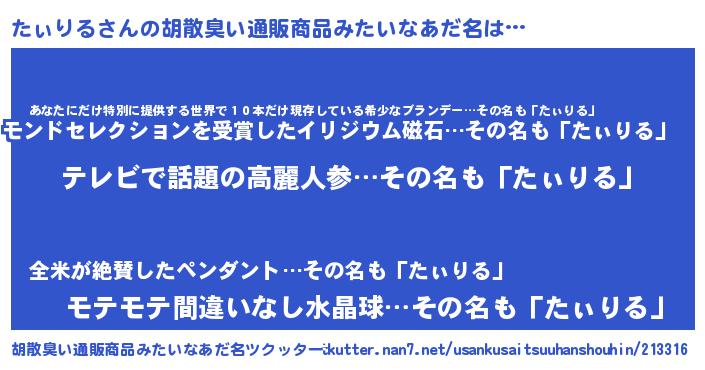 | 意味不明あだ名 | 『自称たぃりる』『ペロリンたぃりる』 |